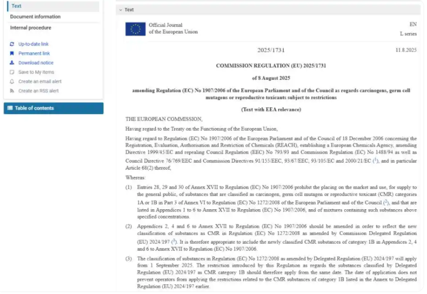 2025年8月11日,歐盟委員會(huì)在《歐盟官方公報(bào)》正式發(fā)布了新法規(guī) (EU) 2025/1731,對(duì)REACH法規(guī)附件XVII中致...
