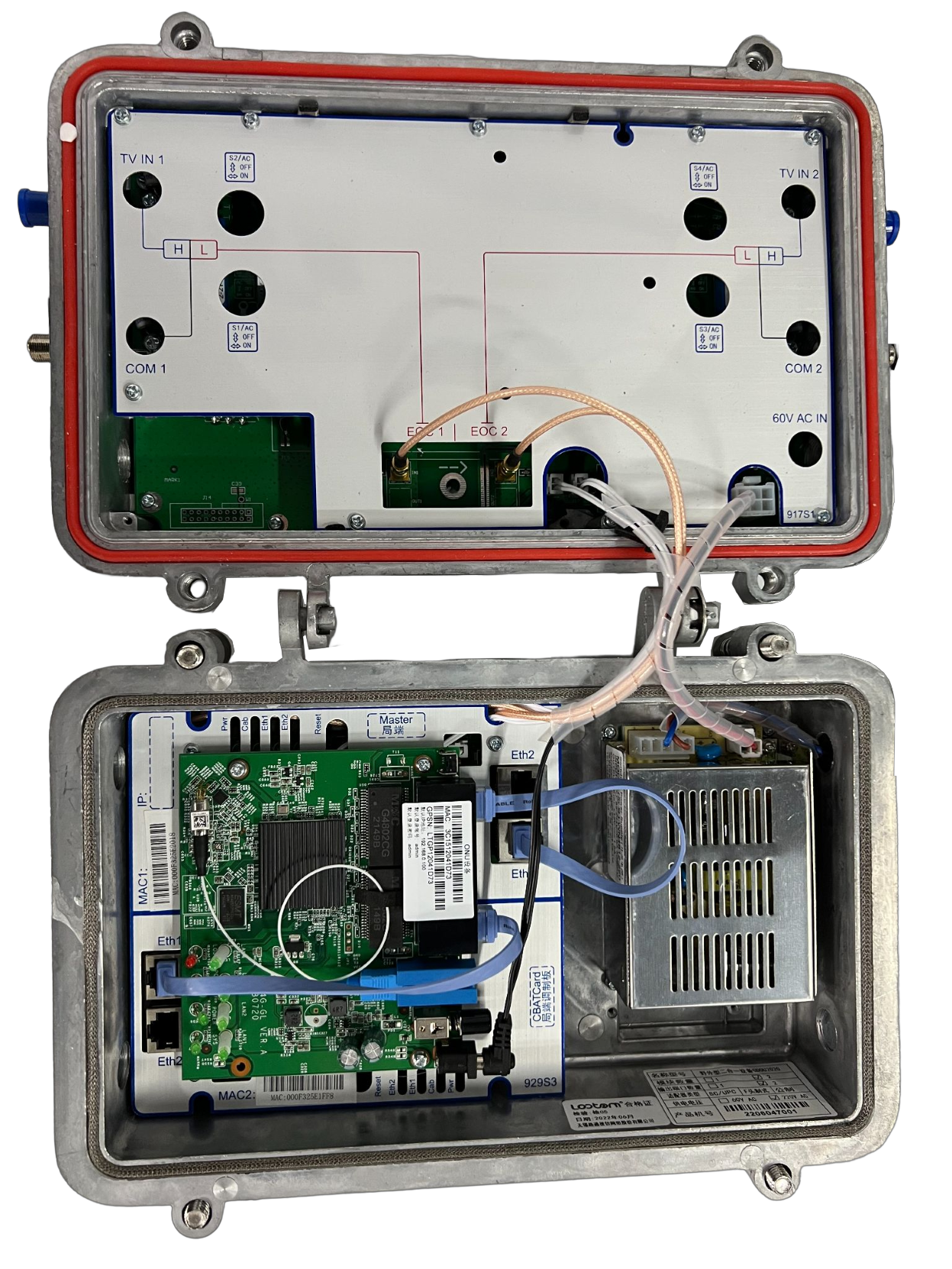 This node integrates EOC、ONU、TV & DATA functions.. GDOU2000 series two-in-one internal EOC module adopts a hot-swappable modular design with high isolation,configuring by demand ,networking flexibly ,upgrading smoothly.Initially