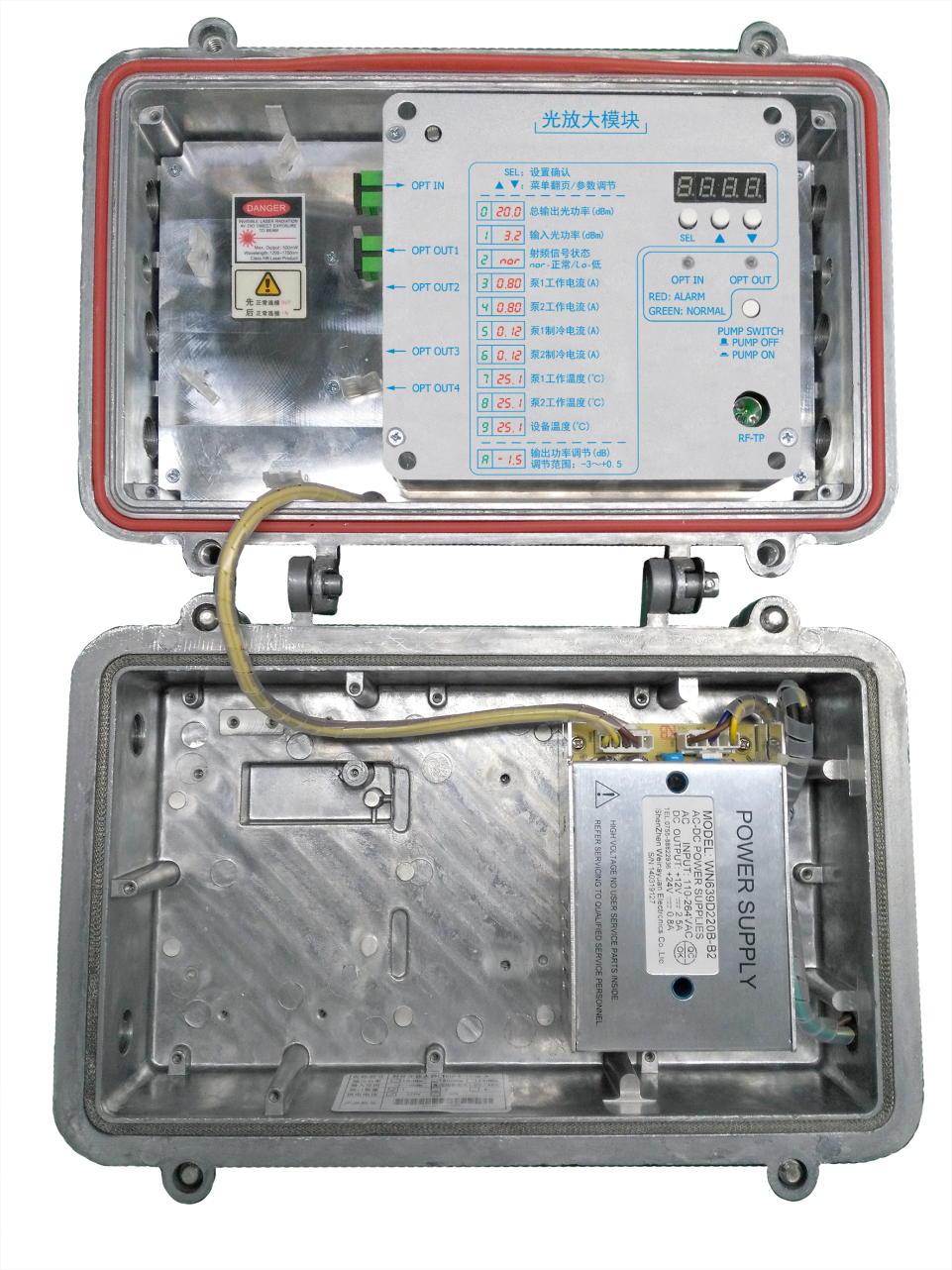 Overview        LTEDFA-1550-5 series outdoor optical amplifier, is designed in accordance with GY / T 184-2002 "cable television system analog fiber amplifier technical requirements and measurement methods" standard. The use of internationally renowned brands of constant-frequency constant-temperature pump, low noise, saturated output power and high stability, can be used for cable television images, digital TV signals, telephone voice signals and data signals in long distance and large area. It is a preferred product for outdoor optical transmission system.